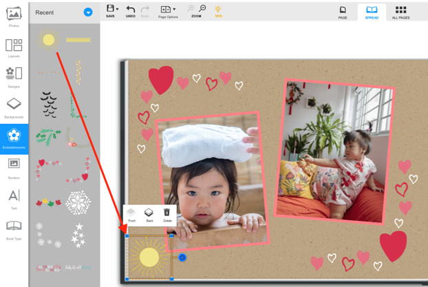 - Drag and drop an embellishment to the page of your book or calendar (see below).